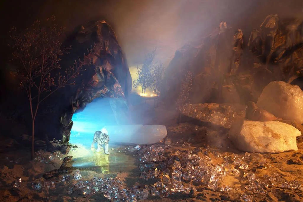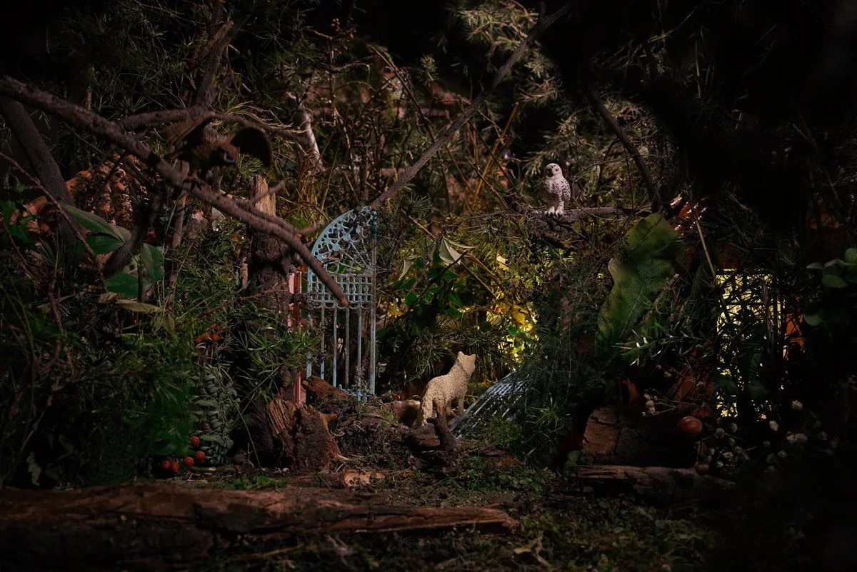 The images portray carefully manufactured miniature landscapes which showcase a world where animals take over spaces that humans have taken from them in the past. Alexandra Uhart used only organic elements like flowers, tree branches, small plants, sand and others, combined with on-set special effects such as fog, fire and running water, to achieve a natural feel to the photographs. However, the animals, houses and furniture are all plastic toys, chosen to express how humans have altered the world to suit their need for comfort and entertainment.