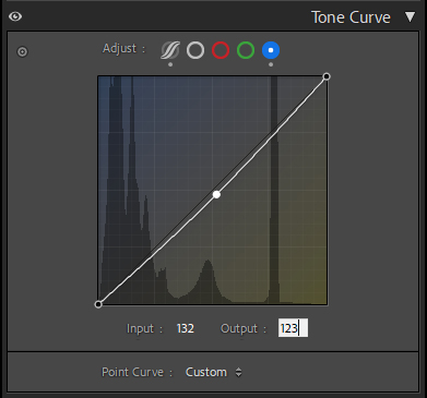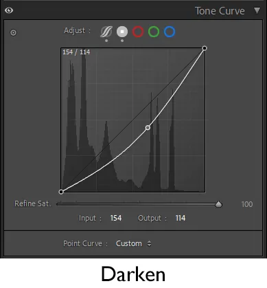 If the targeted adjustment tool (small circle in the upper left corner of the Lightroom Tone Curve panel) is enabled, a circle appears on the curve. It represents the tonal values over which the tool is hovering. When a point pulls the curve down, the image darkens; if it pulls it up, the image lightens. When a point is set at the bottom of the line to lower it and another point is applied at the top to raise it, the line takes on an S shape; the contrast of the image increases. If the slope of the curve is steeper than the diagonal, the contrast increases; if it is shallower, the contrast decreases.