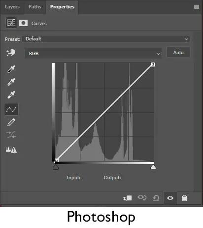By default, a curve is displayed as a grid with a diagonal line. The straight line at 45° indicates that no adjustment has been applied: the input values are identical to the output values.