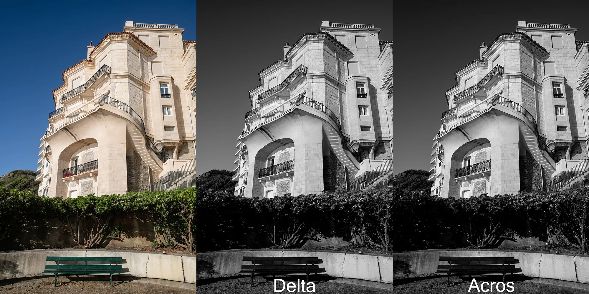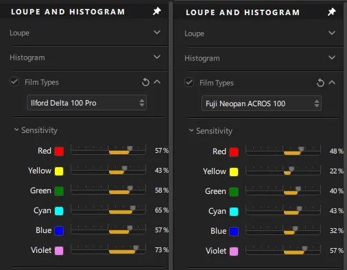 Different black-and-white films translate colors into unique grayscale tones. For example, Fujifilm Acros 100 renders blue as a slightly deeper gray compared to Ilford Delta 100. Silver Efex mimics these specific differences by adjusting its color sensitivity.