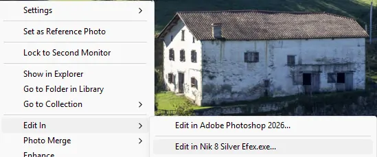 You can edit the image in Silver Efex by right-clicking on it. Note that the file extension (.exe) indicates Lightroom is being used on a Windows PC; the extension would be .app on a Mac.