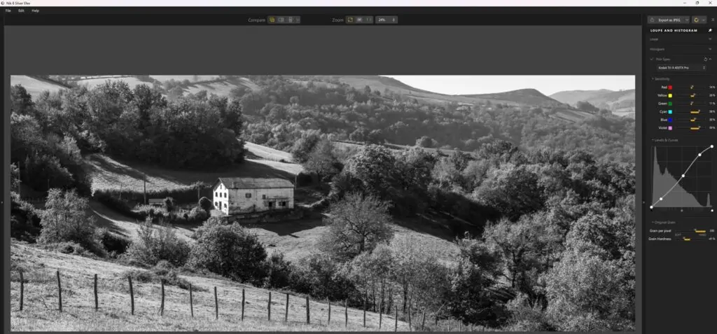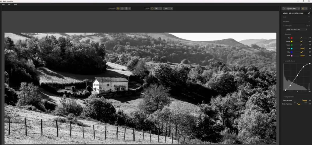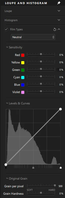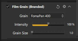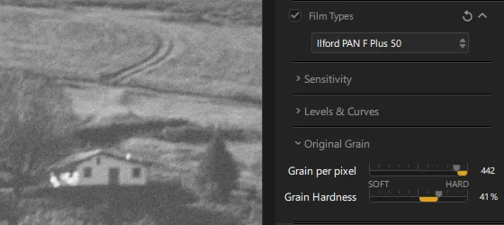 42 film grain filters can be applied to the image. The intensity and size of the grain can be adjusted for each film.