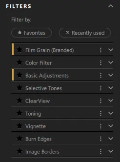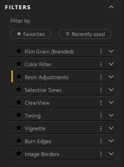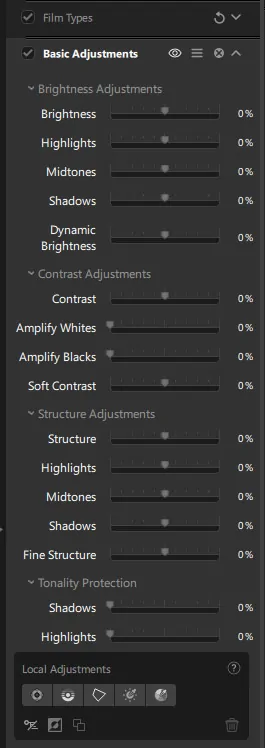 The Basic Adjustments appear in the right-hand panel when they are enabled in the Filters section of the left-hand panel. Local adjustments are also available. They work in a similar way to those in Lightroom.