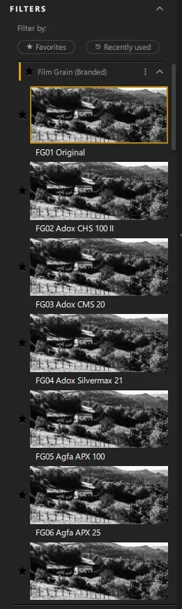 The list of films in the right-hand panel (Film types) dates back to the early versions of Silver Efex, before it was acquired by DXO. It contains 28 films. The latest versions of the software include an additional list of films, drawn from DXO’s expertise in film simulation, particularly through its FilmPack software. They are available in the filter list on the left panel, in the Film Grain (Branded) section. This brings the total to 42 simulations. It’s a fascinating journey into the world of film grain, as these settings do not apply any curves or color brightness sliders.