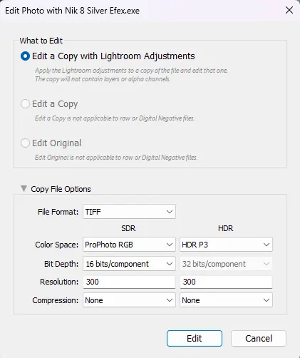 When editing an image, it is recommended to work on a copy of the file within Lightroom to preserve the original. For optimal quality, save the edited file as a 16-bit ProPhoto TIFF at 300 dpi, as Lightroom uses the ProPhoto color space. This TIFF file will be automatically included in your Lightroom catalog.