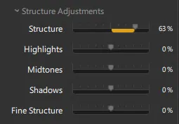 Adjusting the structure enhances the image’s microcontrast, mirroring the effect of boosting a print’s contrast in a conventional darkroom. This contrast adjustment can be applied across the entire range of gray levels, spanning from the deepest shadows to the brightest highlights.