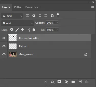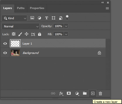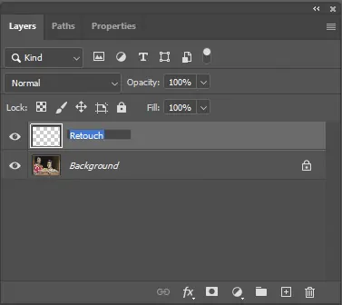 El retoque se puede realizar directamente en la imagen base, que es el fondo. Pero se trata de una operación destructiva. Los errores solo se pueden corregir volviendo al historial. Y el historial desaparece cuando se guarda y se cierra la imagen. Es mejor crear una capa vacía separada sobre el fondo (Capa > Nueva > Capa o Ctrl+Mayús+N en PC, Cmd+Mayús+N en Mac).