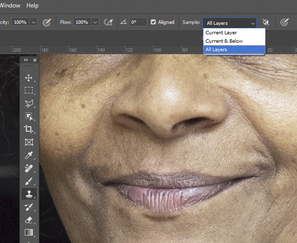 En la barra de opciones de la herramienta de sello, se marca «Todas las capas» o «Activa y inferiores» para tener en cuenta el contenido del fondo.