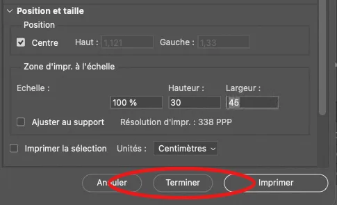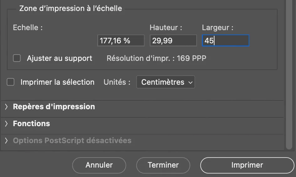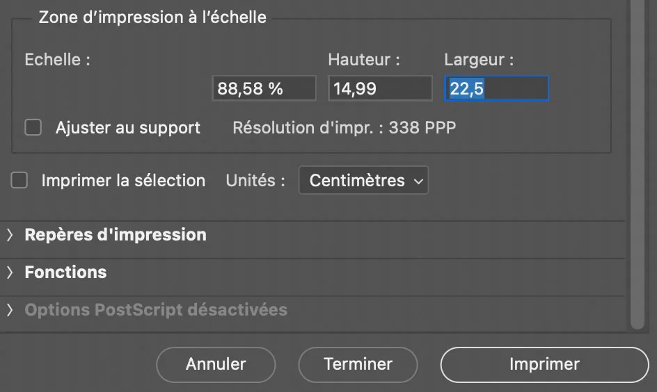 Si Photoshop mémorise la résolution, il ne peut en revanche mémoriser une taille d’image en cm (ou mm ou pouce) pour des images de taille différente de celle qui a servi pour créer l’action. A moins de conjuguer un rééchantillonnage de la résolution avec un ajustement dimensions en cm. L’action créée à partir d’un fichier de 6000 x 4000 pixels avec un fichier de 3000 x 2000 pixels, les paramètres d’impression de Photoshop ne vont pas mémoriser les 45 cm de long, mais la résolution de 338 ppp. La fenêtre d’impression de Photoshop affichera en conséquence une image de 22,5 cm de long. Il faudra donc ajuster la longueur à 45 cm dans les paramètres d’impression.
