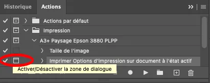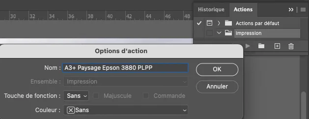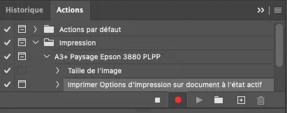 Une action s’élabore en listant un certain nombre d’étapes. Puis on applique les étapes à une image de référence pour créer l’action. Il faut générer autant d’actions que de paramètres d’impression différents (taille du tirage, imprimante et type de papier). Mais la plupart du temps, on imprime avec une sélection restreinte de papiers et de formats. Quelques actions suffiront.