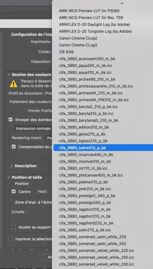 Si les paramètres d’impression de Photoshop sont plus sophistiqués que ceux de Lightroom, l’application ne propose pas de préréglages aussi faciles à mettre en œuvre que dans Lightroom. Quand on a besoin d’un profil ICC dans Photoshop, on doit subir une liste infinie qui réunit aussi bien les profils de prise de vue, de calibrage d’écran, d’impression RVB et CMJN, etc. Il est impossible d’enregistrer une sélection ciblée de profils, à la manière d’une “short list”. Mais il existe un remède. Une action peut intégrer les paramètres d’impression de Photoshop et mémoriser une foule de réglages.