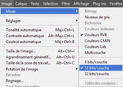 Contrairement aux fichiers Raw, toute modification d’une image matricielle est irréversible et peut entraîner des effets indésirables, comme des cassures de ton (banding), des halos, etc., notamment lorsqu’on effectue de nombreuses modifications. Rappelons que la profondeur d’échantillonnage de 16 bits préserve mieux les nuances d’une image retouchée. Vérifiez dès l’ouverture de votre fichier s’il est en 8 bits ou en 16 bits dans Image > Mode.