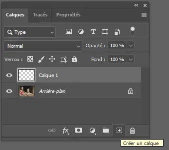 La retouche peut se pratiquer directement dans l’image de base, qui est l’arrière-plan. Mais c’est une opération destructive. Les repentirs ne se corrigent qu’en revenant dans l’historique. Et l’historique disparaît quand l’image est enregistrée puis fermée. Mieux vaut créer un calque vide distinct au-dessus de l’arrière-plan (Calque > Nouveau > Calque ou Ctrl+Maj+N sur PC, Cmd+Maj+N sur Mac).