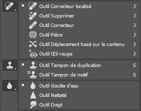 Plusieurs outils permettent les retouches non destructrices sur un calque vide : correcteur, correcteur localisé, pièce, supprimer, déplacement basé sur le contenu, pinceau, tampon, goutte d’eau, doigt, netteté. Pour que ces outils soient actifs, il faut sélectionner Echantillonner tous les calques dans la barre d’options de chaque outil.