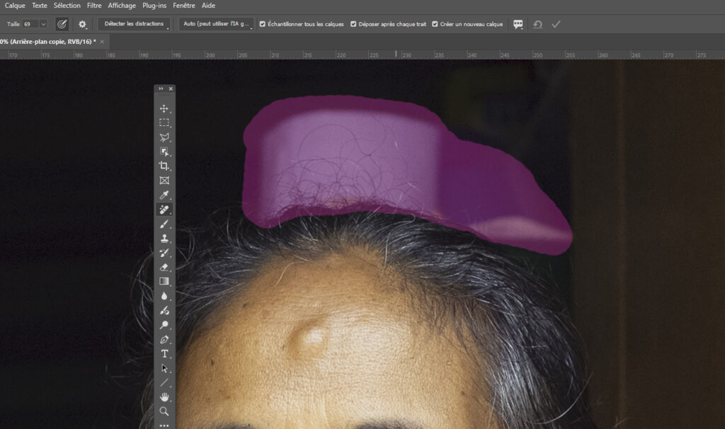 Dans la barre des options de l’outil, l’arrière-plan est pris en compte avec « Échantillonner tous les calques ». Quand l’option “Déposer après chaque trait” est décochée, la sélection des zones à supprimer peut s’effectuer de façon progressive. Puis il suffit de valider ou de réinitialiser.