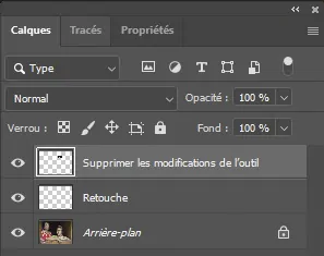 Dans la barre des options de l’outil, l’option “Créer un nouveau calque” génère automatiquement un nouveau calque spécifique à l’outil de suppression. Nommé par défaut “Supprimer les modifications de l’outil”, il indique qu’on peut effacer le contenu du calque pour revenir à l’image initiale.