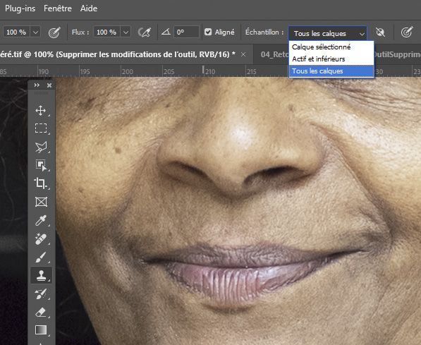 Dans la barre des options de l’outil de tampon, « Tous les calques » ou « Actif et inférieurs » est coché afin de prendre en compte le contenu de l’arrière-plan.